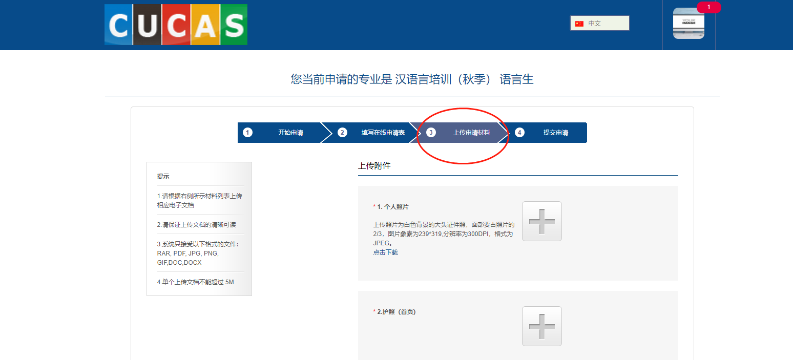 9、接下来上传申请附材料 (“*” 为必填),完成上传,点击“下一步”。